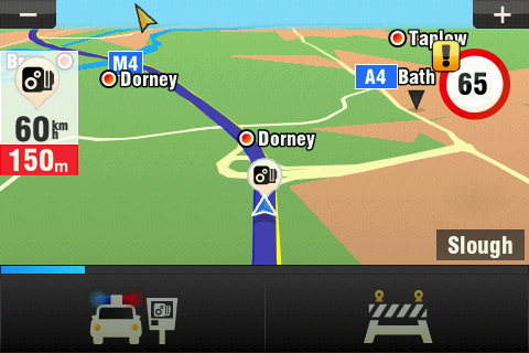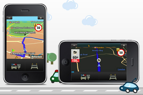 Info o aktuálnej povolenej rýchlosti je zobrazované na displayi počas navigovania. Možnosť upozorňovania na max. povolenú rýchlosť sa dá zvlášt nastaviť pre mesto a mimo mesta. Zvukové varovanie pri prekročení rýchlostného limitu je samozrejmosťou. Navigovanie je z 3D pohľadu ako ste zvyknutý z normálnych navigačných APP. Možnosť nastavenia denného a nočného režimu, domácej adresy, obľúbených destinácií, prístup do kontaktov tel. a vyhnutie sa spoplatneným úsekom určite potešia. Ikony v menu sú dostatočne veľké a neni problém APP bezpečne ovládať ani v aute. Prepnutie do “landscape” módu je bezproblémové a zvižné aj na iPhone 3G. Plánovanie a simulácia trasy je štandardná. Obsiahnuté mapové podklady: Andorra, Austria, Belgium, Bulgaria, Croatia, Czech Republic, Denmark, Estonia, Finland, France, Germany, Gibraltar, Greece, Hungary, Ireland, Italy, Latvia, Liechtenstein, Lithuania, Luxembourg, Malta, Monaco, Netherlands, Norway, Poland, Portugal, San Marino, Slovakia, Slovenia, Spain, Sweden, Switzerland, United Kingdom, Vatican City State.