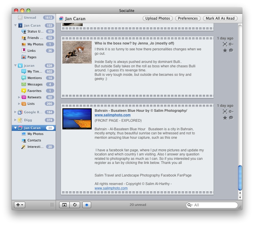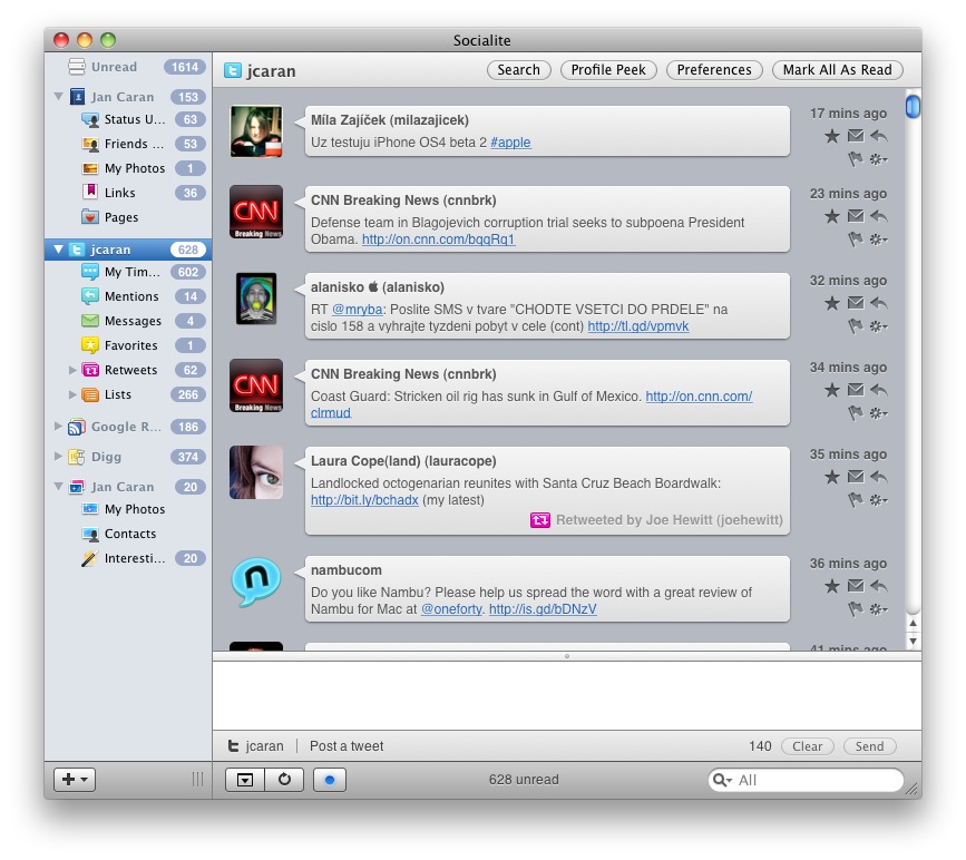 Hlavným dôvodom prečo som sa rozhodol pre Socialite a čo je jej nesporná výhoda aj v dnešnej dobe oproti konkurencii je riešenie “all in one”. Teda podpora Facebooku, Twitteru, Google readeru ako aj služieb Flickr, Digg a RSS na jednom mieste. Aplikácia používa štandarné Mac OS X rozhranie a aj priemerný užívateľ nebude mať problémy s jej ovládaním. Jej používaním získate na sociálne služby úplne iný pohľad a jej každodenné používanie si zamilujete.