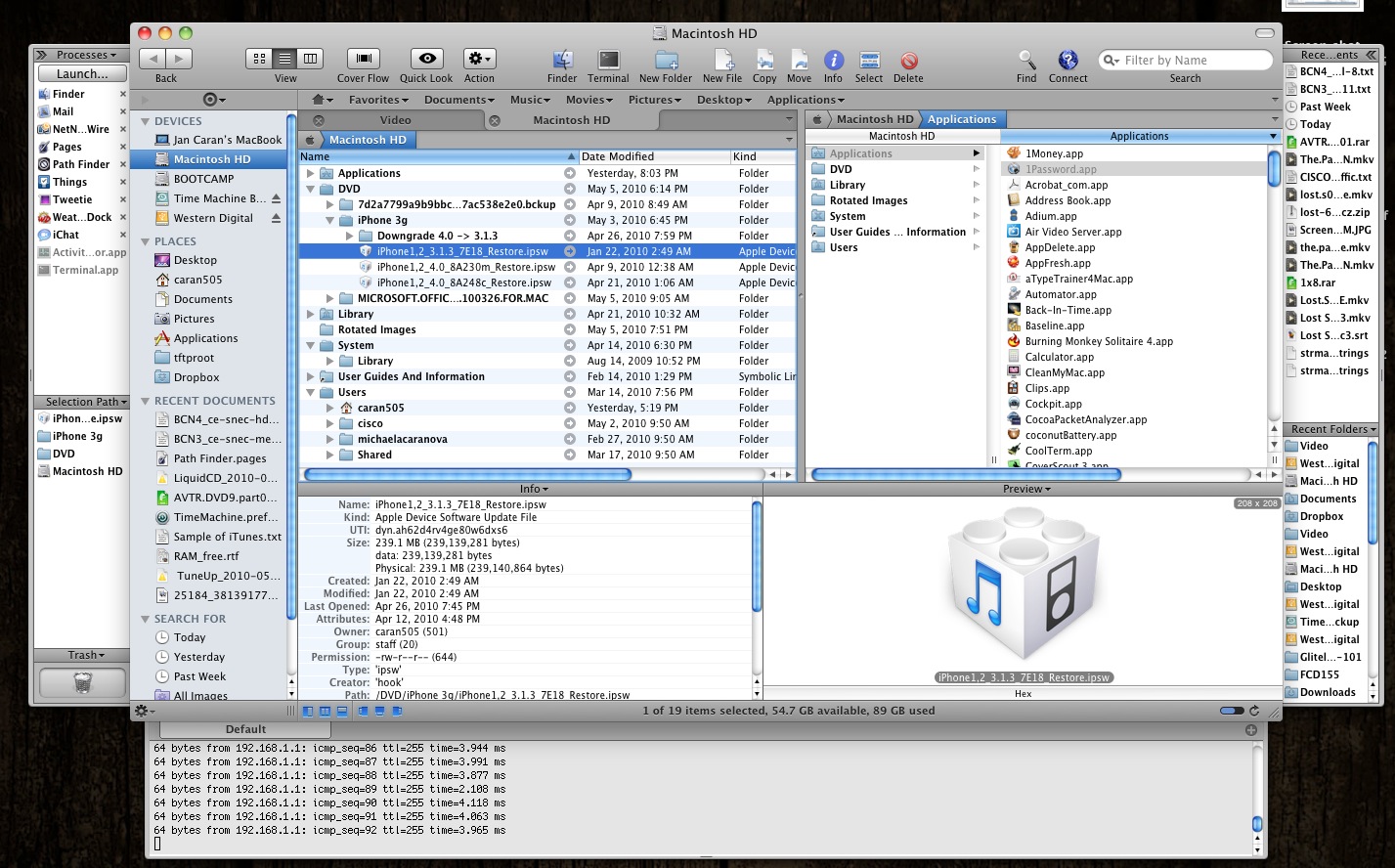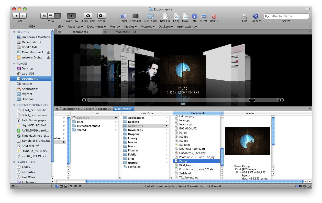 Zo spodu si môžete dať vysunúť okno terminálu s možnosťou otvorenia na záložkách. Záložky tak ako ich poznáme zo Safari alebo z programu “Total Finder” môžeme využívať aj v hlavných oknách, čo nám značným spôsobom rozširuje možnosti správy súborov. Prácu s komprimovanými súbormi môže vykonávať Path Finder sám alebo v spolupráci s externým programom. Jedným kliknutím môžeme nechať adresár skomprimovať a odoslať ako prílohu mailu. O otváranie a editáciu textových dokumentov (txt, rtf) sa môže tiež postarť tiež Path Finder. Veľmi podarené je rozšírené vyhľadávanie s možnosťou výberu podľa prípony, určitých znakov v názve, atribútov, dátumu vytvorenia/editácie a mnohých iných. Daľšou lištou ktorá vám uľahčí prácu je “Bookmark bar” kde si môžeme uložiť často používané adresáre alebo súbory tak ako to robí Safari zo záložkami. Aplikácia používa virtuálnu schránku “Drop Stack” do ktorej si môžete umiestňovať súbory ako do dočasnej schránky na neskoršie použitie. Aplikácia tiež umožňuje pripájanie na sieťové disky alebo FTP servery a celkom obstojne zvláda prácu s nimi. Môžeme si upraviť aj rýchle menu ktoré sa nám zobrazí po stlačení pravého tlačítka myši s zvoliť položky ktoré majú byť v menu obsiahnuté. Na spodnej lište tiež vidíme počet súborov v adresári, dostupné a obsadené miesto na disku, čo máme aj graficky znázornené. V “Menu Bare” máme ikonu programu pomocou ktorej môžeme spúštať aplikácie, spraviť screenshot, vstúpiť do zoznamu obľubených položiek alebo prepínať medzi spustenými aplikáciami.