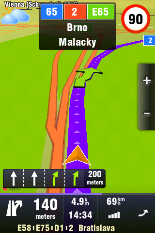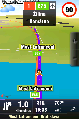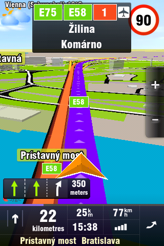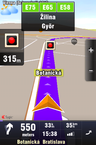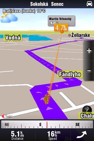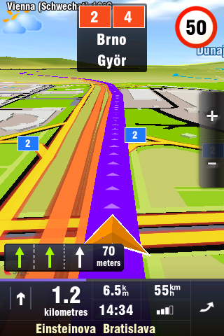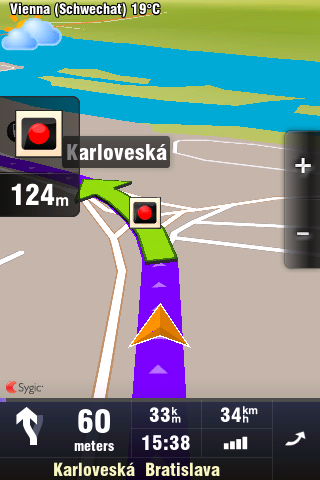 Na stavovej lište počas navigovania máme zobrazenú vzdialenosť do nasledujúcej odbočky, zostávajúci počet kilometrov do cieľa, približný čas príjazdu do cieľa, aktuálnu rýchlosť, silu GPS signálu a  názov ulice na ktorej sa náchádzame aj s popisnými číslami domov. Počas navigovania si môžeme nechať zopakovať posledný hlasový povel kliknutím na stavovú lištu v mieste zobrazenia šípky  informujúcej o nasledujúcej zmene smeru jazdy. Kliknutím do stredu stavojej lišty sa nám zobrazia dve veľké ikony a to: nahlásenie policajnej hliadky a dopravný incident. Tieto informácie sú prostredníctvom dátového prenosu odoslané do centrálnej databázy a odťial sú distribuované ostatným užívaťelom pokiaľ  v nasledujúcich 3 hodinách budú precháchzať rovnakou trasou. To zaručuje takto poskytnutým údajom určitú mieru aktuálnosti. Samozrejme tieto informácie sú závislé od množstva užívateľov ktorý budú tieto informácie poskytovať. Zobrazovanie štandardných “Speed Cam” si môžete zapnúť v menu. Milo som bol prekvapený z toho že moja aktuálna poloha sa na 90 percent zhodovala so zobrazením na mape a nejaké oneskorenia, hlavne pri odbočeniach, známe z iných navigácií develeper celkom úspešne eliminoval. Veľmi dobre má Sygic vyriešené zobrazovanie 3D budov. Oproti konkurencii nešiel cestou detailného zobrazovania každej budovy, čo v konečnom dôsledku rapídne znížilo počty 3D budov v menších mestách a tieto boli samozrejme aj náročnejšie na grafiku pri zobrazovaní. Zamerali sa na zobrazenie 3D budov ako nejakých kvádrov/kruhov  ktorých rozmery zodpodedajú reálnym rozmerom bez zbytočných detailov ako sú okná, dvere, šikmé strechy a podobne. Aby nám pri navigovaní budovy neclonili vo výhľade sú objekty pri približovaní dynamicky znižované až na úroveň terénu. Otáčanie do horizontálneho pohľadu zabezpečuje akcelerometer a jeho reakcie sú porovnateľne rýchle s iPadom. A to vďaka tomu že aplikácia otočí obraz aj za cenu natiahnutia/stlačenia obrazu a až následne zmení rozlíšenie obrazu. Taktiež podporuje funkciu „Lane Assistent“ (radenie do jazdných pruhov), ktorá je dnes už samozrejmosťou u každého renomovaného výrobcu.