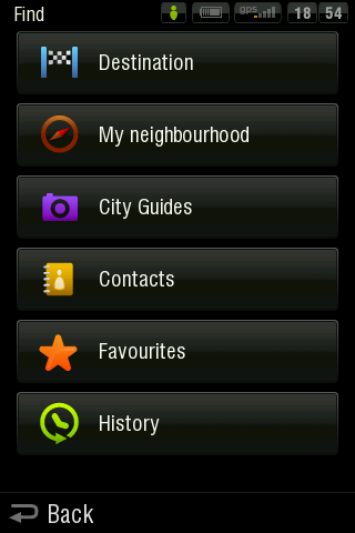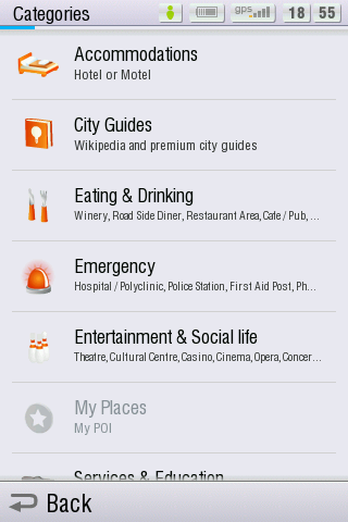 2. “My neighbourhood” je zoznam “vašich susedov” teda POI  vo vašom okolí. Otrávený skúsenosťami z iných navigačných programov som neočakával nejakú početnú databázu týchto bodov ale na moje prekvapenie som tak širokú databázu POI rozhodne nečakal. K nájdeniu sú okrem nákupných stredísk, reštaurácií, úradov, zravotníckych zariadení a pamätihodností aj miesta určené na zábavu dokonca v menších okresných mestách.