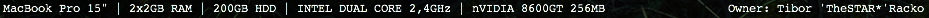 echo "MacBook Pro 15\" | 2x2GB RAM | 200GB HDD | INTEL DUAL CORE 2,4GHz | nVIDIA 8600GT 256MB"