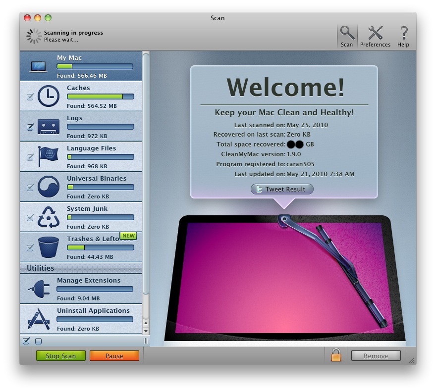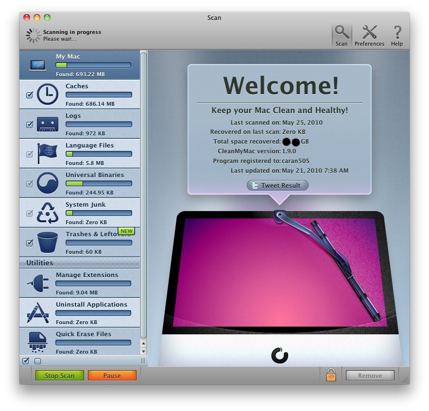 Ďaľšou možnosťou ktorú nám CleanMyMac ponúka je tzv. “Secure erase” ktoré zabezbečí po odstránení súboru jeho trojnásobné prepísanie na disku bez možnosti jeho obnovenia bežným spôsobom. Po pretiahnutí aplikácie na odinštalovanie nám aplikácia vyhľadá všetky súbory prisluchajúce k danej aplikácii a navrhne nám možnosť ich odstránenia. Preto sa nám nestane že po odstránení aplikácie nám po nej zostane na disku plno balastu. V nastaveniach máme možnosť výberu jazykov ktoré chceme zachovať a naopak ktoré chceme zo systému odstrániť. V “Manage Extension” náme aj možnosť odstránenia doplnkov z “Preference pane” ako napríklad Growl, Perian, MagicMenu, SpiceRack a iné. Tiež vieme odtrániť nepotrebné Pluginy doinštalované do systému. Nakoniec môžete o aktuálne uvoľnenom mieste na disku informovať svojich známych cez Twitter. :-)
