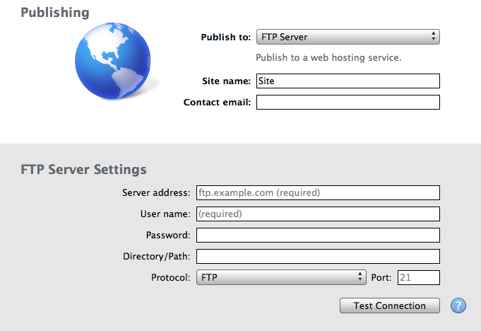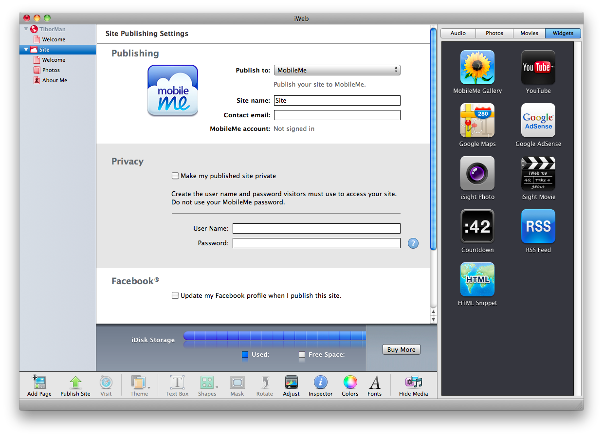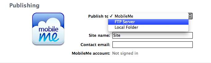 V levé části programu v menu uvidíme název Site a pod ním odsazenou stránku Welcome. Kliknutím na název Site se dostaneme do nastavení webu. Kde máme možnost si vybrat ze 3 druhů publikace webu. Jedná se o službu MobileMe, která je placená (dá se zřídit zkušební test po dobu 60-ti dnů), pak máme další možnost FTP server a jako poslední možnost Local Folder (localhost). Takže teď je jen na Vás jakou službu zvolíte a podle toho se odvíjí nastavení.