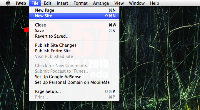 Takže spustíme aplikaci iWeb ze složky aplikací, pokud jsme aplikaci neměli nikdy spuštěnou, najede nám iWeb přímo do průvodce vytvořením prvního webu. Pokud nám průvodce nenajede, pokračujeme přes nabídku File –> New Site.