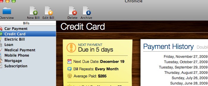 Taky se vám stalo, že na konci měsíce zjistíte, že jste za něco utratili pár stovek, ale nemůžete si za žádnou cenu vzpomenout za co. Chronicle vše organizuje a řadí účty placené nejen kreditní kartou. Díky jednotlivým kategoriím si řadíte účty za telefon, auto, leasing, bydlení, jídlo a další kategorie. Nejlepší je, že vám program na závěr pomůže účt co nejvíce snížit.