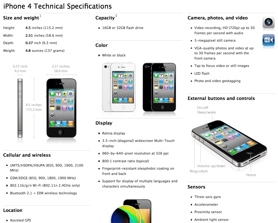Nový iPhone 4 (tak zní jeho konečný název) přináší více jak 100 nových funkcí a vychytávek. Design skutečně vypadá tak, jak uniklé prototypy. Samozřejmě tedy přináší čelní kameru, přisvícení pomocí led diod. Je o 24% tenčí než iPhone 3Gs. iPhone 4 funguje podobně jako iPad na Micro-Sim karty. Dále obsahuje Wi-fi Bluetooth, GPS, UMTS a GSM sítě. Celý kovový rám telefonu slouží nyní jako anténa. Jedna část na Wi-Fi a druhá část na GSM. Apple použil novou technologii pro display iPhone 4, nyní obsahuje 4x větší hustotu bodů než iPhone 3Gs.  Displej má rozlišení 326 rozlišení na palec, tedy displej který ještě nikdy nebyl použit u mobilního telefonu. Maximum schopností rozlišení lidského oka je 300 pixelů na palec, přístroj tedy dosahuje naprostého maximam co je člověk schopný vnímat. Apple nemohl nasadit OLED Displej, ten nedosahuje potřebného rozlišení. Displej dále využívá IPS technologii pro naprosto reálné podání barev. Novinkou je Gyroskop, v kombinaci gyroskopu + accelometeru dosáhne iPhone možnosti snímat pohyb do 6 os (3 osy Gyroscoope + 3 osy Accelometr).  Nyní může také měřit rychlost a sílu pohybu. Vývojáři mohou u jedné aplikace využít Gyroscoop, Proximity senzor, Accelometr a Light senzor. Apple vylepšil kamerový systém, ten nyní obsahuje dvě kamery, zadní má 5 megapixelů + 5x zoom + LED diodu pro blesk + umožní nahrávat HD Video 720p při 36 pixelů. Dokonce Apple představil novou aplikaci iMovie pro iPhone! Steve Jobs ještě upozornil, že aplikace iMovie bude stát 4,99 dolarů, tedy pouze pokud ji povolí, jak Jobs zaftípkoval!