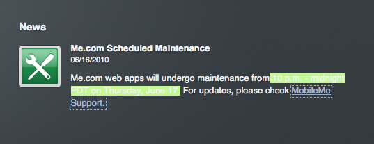 Na zítra je naplánovaná pravidelná údržba MobileMe. Je docela dost možné, že se tímto Apple připravuje na brzké uvedení iOS4. Aktuálně jsou totiž jestě problémy spojené s budoucí verzí iOS4 a MobileMe. Stále třeba nefunguje služba “Find My iPhone“ s poslední uveřejněnou Beta-verzi iOS.