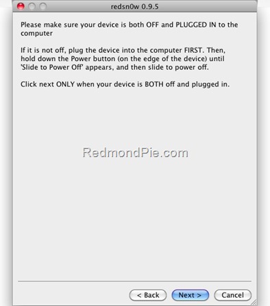 - Po kliknutí na “Next budeme vyzvaný na stačenie a držanie “Power button” (v Redsn0w uvídíme odpočítavanie času po dobu ktorého stále držíme “Power button”