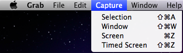 Trošku pokročilejší funkce nám pak nabízí aplikace jménem Grab (Applications > Utilities > Grab). Aplikace se ovládá přes horní lištu, nebo klávesovými zkratkami. Pro zhotovení snímku máme tyto možnosti: