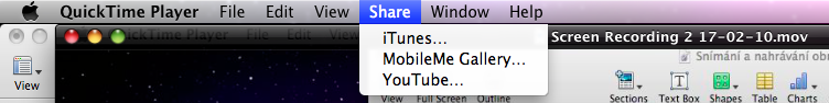 Nahrávání poté spustíme kliknutím na červené tlačítko, následně ještě začátek nahrávání potvrdíme v okně, které nám vyskočilo. Ukončíme ho nahoře na liště tlačítkem “Stop recording”, nebo klávesovou zkratkou Cmd+Ctrl+Esc. Výsledné video ještě můžeme oříznout přímo v QuickTime Playeru. Stačí otevřít video, nahoře na liště zvolit Edit > Trim. Dále ho můžeme rovnou publikovat na Youtube, MobileME, či importovat do iTunes. To vše ve stejné aplikaci, tentokrát pomocí nabídky Share.