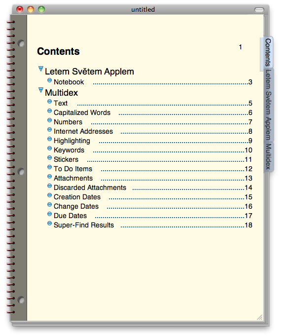 Jednou z nejpovedenějších věcí je tzv. Multidex, který zastupuje funkci rejstříku. Sbírá data do jednotlivých kategorií: klíčová slova, štítky, internetové adresy, čísla apod. Samozřejmě, že je integrován i Spotlight. Takže se skutečně ve svých poznámkách, at’ už pomocí funkce Multidex nebo Spotlight, neztratíte. Osobně považuji za jednu z velkých plus i možnost vytváření To-Do listů a záznamů, které si můžete následně synchronizovat s vaším iCalem. Jakmile budete mít vaši poznámku nebo celý váš deník hotový, můžete si ho vyexportovat do pdf, nebo jako webovou stránku přes MobileMe, FTP a publikovat na webu.