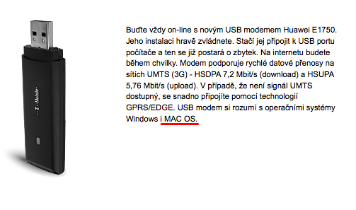 V popisu produktu je napsána záhadná věta, USB modem si rozumí s operačními systémy Windows i MAC OS. Tedy operačními systémy Mac OS, takto však byli operační systémy společnosti Apple označovány pouze do příchodu Mac OS X (10). Tudiž logicky popisek říká, že se jedná o modem kompatibilní se všemi OS Macintosh do verze Mac OS X. To však pochopitelně není pravda a podpora těchto zastaralých systému zde není. Pokud by však autor textu bral popisek tak, že je kompatibilní se všemi Mac OS (operačními systémy), i když by se v dané větě 2x opakovalo slovo operačními systémy, logicky budeme vyžadovat kompatibilitu se vším co kdy neslo označení operační systém Mac, tedy od první verze, až po Mac OS X 10.6.4 Snow Leopard. To však také pravda není, jelikož jak se v návodu dočtete, je kompatibilní pouze s Mac OS X 10.4 Tiger a Mac OS X 10.5 Leopard. Podle posledních průzkumů je celosvětově již více jak 80% uživatelů Macintoshů na operačním systému Mac OS X 10.6 Snow Leopard, otázka tedy je, pro koho produkt vlastně T-Mobile prodává, samozřejmě mám na mysli ze strany uživatelů produktů Apple…..navíc vzhledem k tomu, že výrazný nárust počítačů Macintosh v ČR začal, až s Intel procesory kompatibilními s Snow Leopardem.