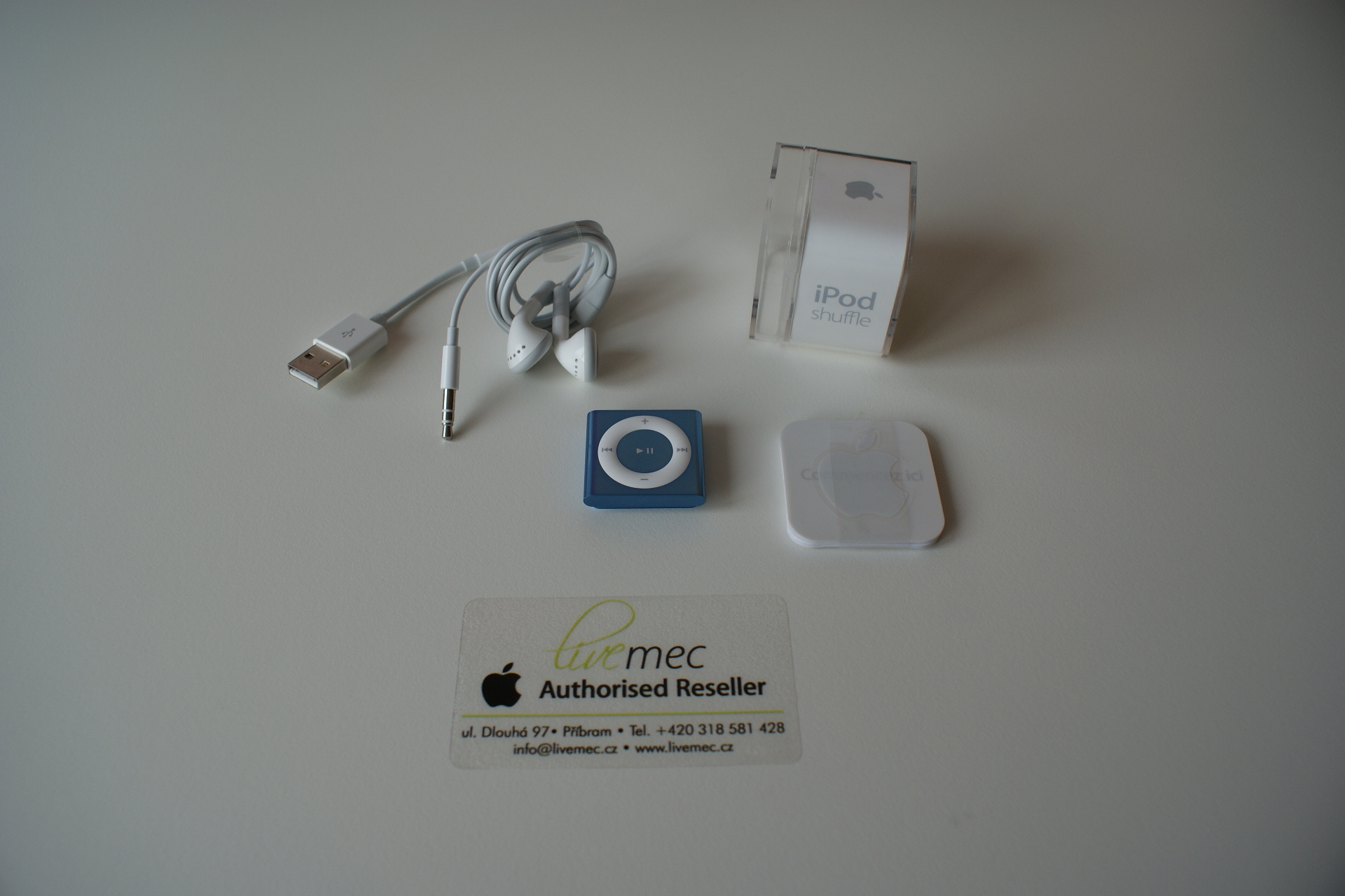 Podle mě dostanete příští iPod shuffle v igelitovém sáčku, nedovedu si totiž představit, jak daleko by mohl Apple ještě zajít při balení svých produktů. Krabička nového shuffle je opravdu miniaturní a jakmile jednou vytáhnete a rozmotáte sluchátka, budete mít co dělat vše zpátky urovnat. V plastové krabičce se ukrývá samotný iPod shuffle 4. generace, který je přilepen k plastové podložce, tím je zajištěno, že se neuvolní a nepoškrábe se při převozech. Dále se v balení nachází klasická bílá Apple sluchátka, prohlášení o shodě s jednoletou mezinárodní zárukou, návod, který jsme měli pouze v němčině a španělštině a miniaturní nálepku nakousnutého jablíčka. Posledním kouskem hardware, který v krabičce naleznete, je synchronizační kabel. Vzhledem k tomu, že iPod shuffle z důvodu velikosti nemá pro Apple typický Dock konektor s 30pin, synchronizace probíhá přes 7cm dlouhý kabel, který se připojuje do 3,5mm klasického jacku na sluchátka. iPod shuffle 4. generace se prodává pouze v 2GB verzi, což je podle mého názoru maximální velikost, kterou lze u přehrávače bez displeje zvládat!