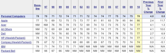 Osobné počítače applu sa už po siedmy rok umiestnili na prvom mieste v rebríčku spokojených užívateľov .( Rebríček pripravila spoločnosť American Customer Satisfaction Index (ASCI)) Čo je zaujímavé, je to, že do osobných počítačov apple zahrnuli aj iPad! Apple zvýťazil na plnej čiare s celkovým pčtom bodov 86 a tím zanechal všetkých výrobcou počítačou ako je Acer, Dell či HP s 9 bodovým rozdielom za sebou.