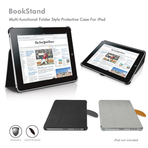Obal vám dojde zabalený v pevné plastové krabičce s reprezentativním potiskem, který je mimo jiné také v českém jazyce. V pouzdře samotném se ukrývá papírový model iPadu v reálné velikosti. Obal se vyrábí ve dvou barvách, šedé a černé. Použitý materiál je semišová kůže, která je prošívaná, díky tomu je zaručena pevnost, ale zároveň také lehkost. Logicky se tedy nabízí otázka, kolik takový BookStand váží, když je tak lehký. Pouzdro váží  202 gramů. Oproti tomu Apple iPad Case váží 171 gramů, zase až tak lehký BookStand tedy není, alespoň co se ve srovnání s iPad Case týká. Ovšem narozdíl od iPad Case od Apple, nemá BookStand ani zdaleka, tak pevnou přední stěnu, která kryje displej. Ta je u Apple více jak o polovinu tenčí, přesto mnohem pevnější (nelze ji promáčknout prstem více než o 0,5cm. Naproti tomu pouzdro BookStand můžete na čelní straně promáčknout o více jak 2cm a není problém jej ohnout do pravého úhlu. Samozřejmě proti poškrábání ochrání oba obaly displej stejně, ovšem pokud na displej něčím zatlačíte, například když máte iPad v batohu, rozhodně bude více chránit Apple iPad Case, než BookStand.