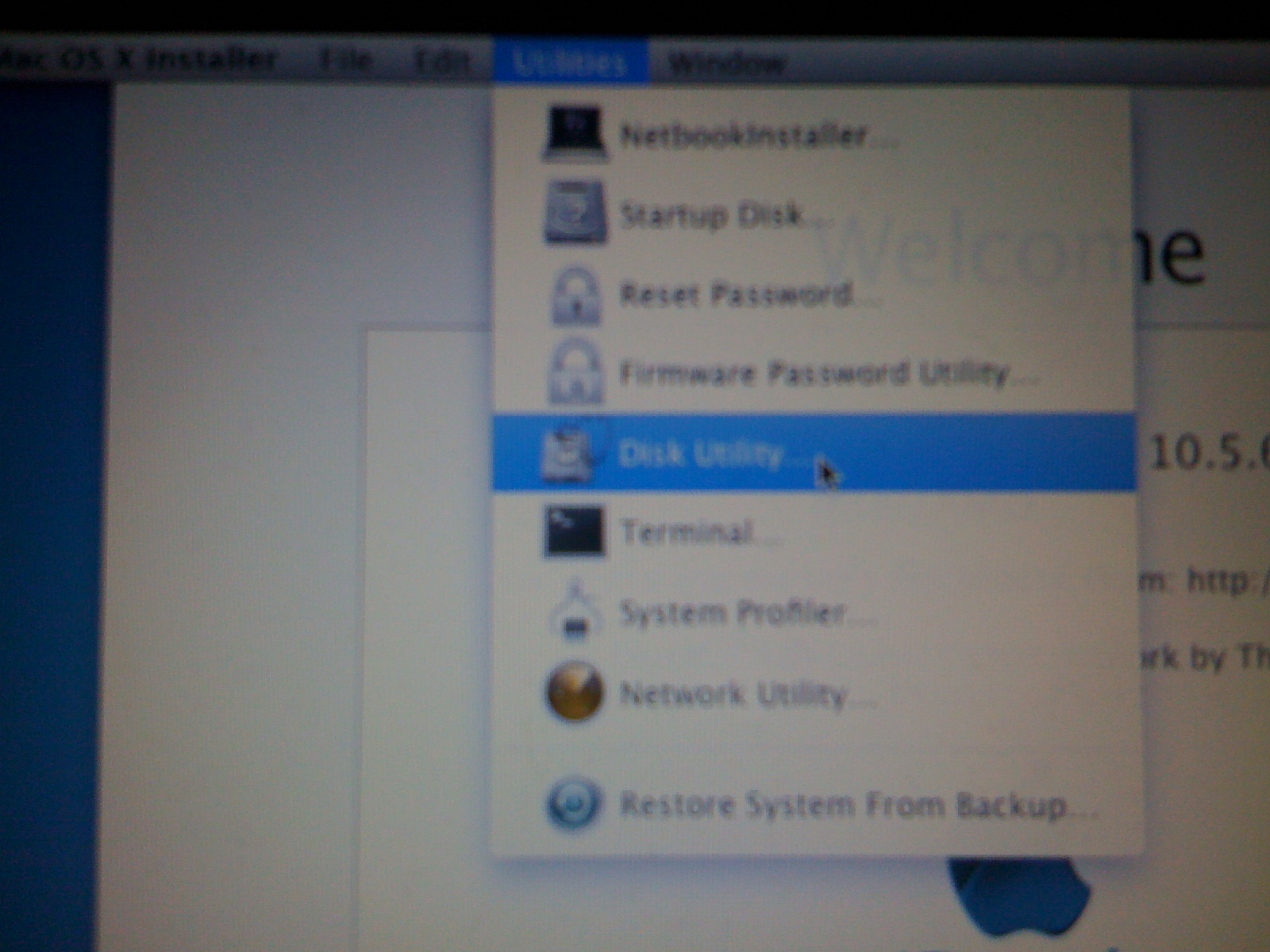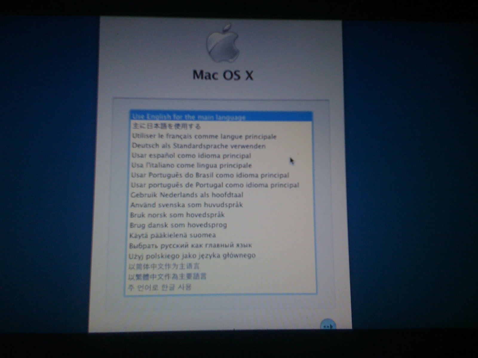 K netbooku připojte bootovací flash disk, nastartujte ho a stiskem klávesy F12 se přepněte do boot menu. Nastavte bootování z flash disku. Mělo by se zobrazit klasické bootovací jablíčko známé z počítačů Apple. Následně by se vám měla zobrazit tato obrazovka
