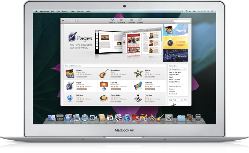 Stejně jako na iPhone bude App Store, budou zde aplikace pro Mac OS X, automaticky si je koupíte, stáhnete zdarma nebo updatujete. Aplikace budou licencovány na všechny vaše osobní počítače. Když si nainstalujete aplikaci automaticky se objeví na Screenu, tak jako na iPadu nebo iPhone. App Store je samostatnou aplikací Mac OS X 10.7 Lion, není součástí iTunes. Je tedy mnohem přehlednější.