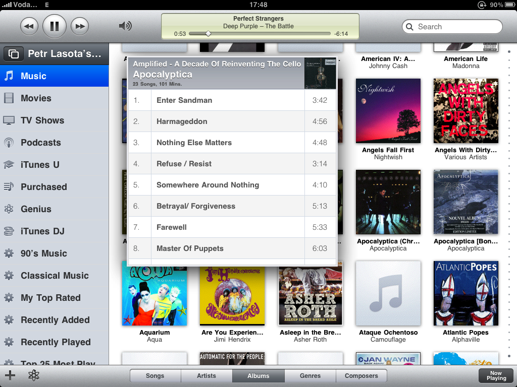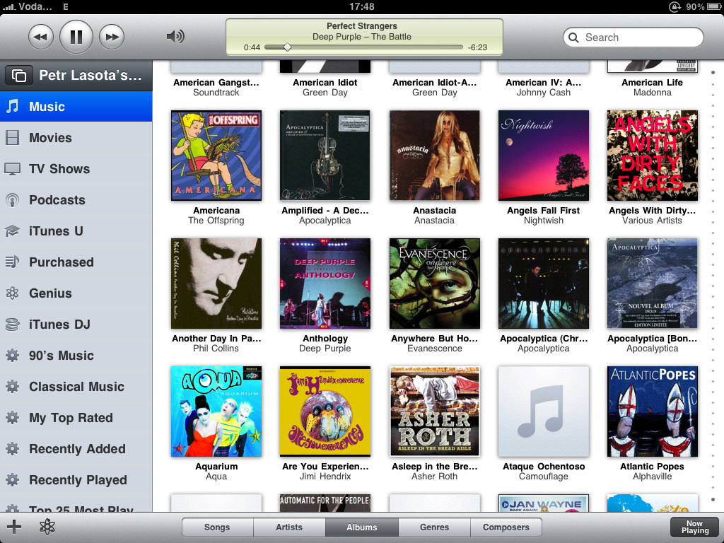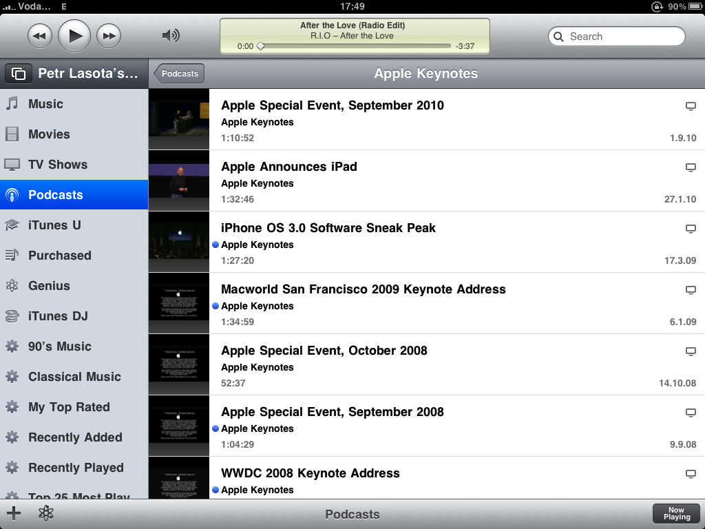 Horní panel s ovládacími prvky je totožný se stolním protějškem, jen hlasitost se mění až po kliknutí na ikonku reproduktoru. Zbytek ovládacích prvků je již takřka totožný s iPod aplikací. V levém panelu přibyla nabídka Movies, TV Shows, iTunes U a jsou zde i všechny playlisty, tak jak je máte v iTunes na Macu. Vytváření Genius playlistů je samozřejmostí, navíc je zde i možnost používat iTunes DJ.