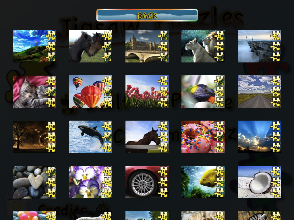 Je zde směsice obrázků krajiny, zvířat, květin a předmětů každodenní potřeby. Na výběr má uživatel tři úrovně skládání podle počtu dílků – 12, 24 a 48. Možná si říkáte, že 48 dílků je vcelku málo. Dá se říci že ano, ale větší počet kousků by se již na tak malé ploše skládal blbě. Co ale dělá tuto aplikaci tak výjimečnou, je možnost složit si libovolný obrázek z vaší galerie v Photos. Máte tudíž neomezený počet možností skládat, co se vám libí nebo na co máte zrovna náladu. Ze základních funkcí se musím určitě zmínit o měřiči času skládání, následně možnosti jej uložit a porovnávat se tak s kamarády. Aplikace vám navíc dovolí měnit si pozadí, na kterém obrázky skládáte. Třešničkou na dortu je možnost si vybrat přímo z aplikace písničky z iPodu a nechat si hrát vaše oblíbené songy během hraní.