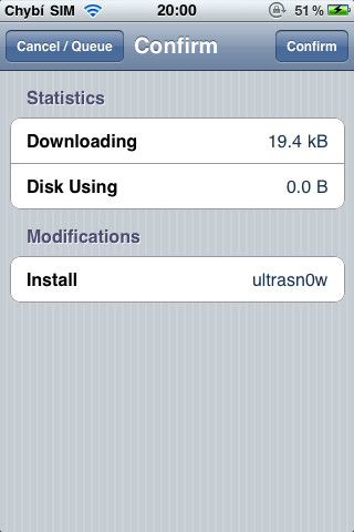 26. krok: Klikněte na Search dole v pravém rohu, napište nahoru do vyhledávače Ultrasn0w. Vyčkejte dokud se vám kolonka Ultrasn0w neobjeví a potom na ni klikněte. Nyní můžete vidět veškeré informace o tomto Unlocku. Klikněte nahoře v pravém rohu na Install a ještě jednou nahoře na Confirm.