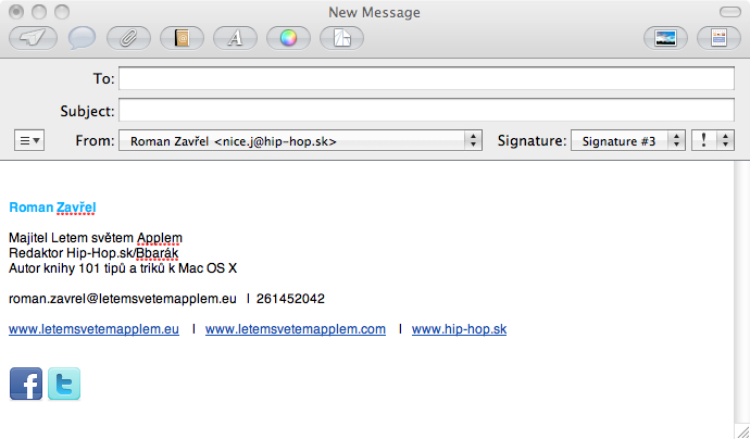 Také už vás nebaví stíle stejně textové podpisy v mailu bez jekékoliv grafiky? Pokud chcete například nyní před vánoci posílat spolu s podpisem mailu automaticky PF, nebo doplňit podpis o ikonky aplikací Twitter a Facebok s přimým odkazem, není to problém. Stačí dodržet následující podpis a můžete si vytvořit originální podpis, který nejen zaujme, ale může vám pomoci získat také pár nových přátel na sociálních sítích, se kterými jste si zatím psali pouze maily. Než se pustíme do samotného návodu je tu ještě jeden tip, pravděpodobně největší a nejkvalitnější databázi icon naleznete na iconarchive.com