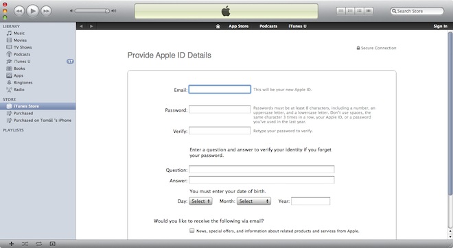 Email – tento email bude vám slúžiť na prihlásenie do iTunes Store, a taktiež bude vašim Apple ID,