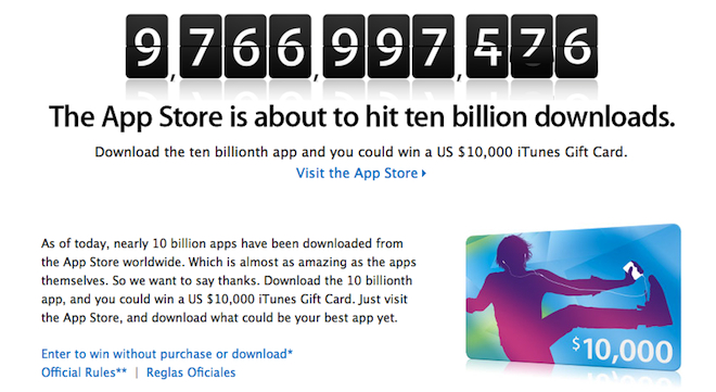 „K dnešnímu dni máme teměř 10 miliard aplikací stažených z App Store po celém světě, což je skoro stejně úžasné jako samotné aplikace. Takže vám chceme poděkovat. Stáhněte si 10 000 000 000 aplikaci a dostanete iTunes Gift Card v hodnotě 10 000$. Stačí navštívit App Store a stáhnout si aplikaci, nejlepší aplikaci doposud!“