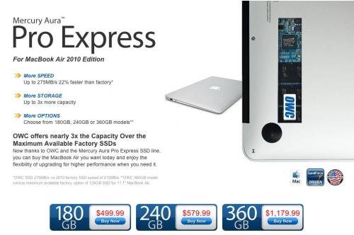 Other World Computing (OWC) minulý týden oznámilo příchod nového Mercury Aura Pro Express SSD disku pro Apple MacBook Air 11″ a 13″ modely z roku 2010. Nový SSD disk má vyšší rychlost a kapacitu, než Applem dodávaný disk. OWC dodává SSD o kapacitách 180GB, 240GB a 360GB. Disky stojí na řadiči SandForce a jsou vybaveny velkým množstvím dalších technologií pro zrychlení rychlosti a výkonu. Nevýhodou pro většinu majitelů Macbook Air bude patrně cena, za kterou chce společnost disky prodávat, ta totiž začíná na 499$ za 180GB model a pokračuje přes 579$ za 240GB model až po 1179$ za model s kapacitou 360GB, což je cena, která hravě přeskočí pořizovací cenu nového MacBook Air 11″. Co je však nejdůležitější z celého textu je fakt, zda Apple výrobu a prodej nezarazí!