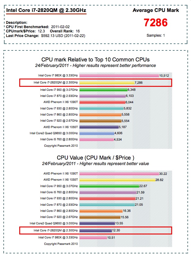 Pokud se vám nezdají nové MacBook Pro dostatečně updatované, podívejte se na srovnání výkonu všech nových modelů, které Apple dnes představil, s těmi z loňského roku. To že se výkonem vyrovnají loňským modelům Mac Pro je první známka kvality, tou druhou pro hodně lidí však mnohem důležitější při rozhodování o jejich koupi je fakt, že každý z nových modelů téměř dvojnásobně zvýšil výkon oproti předchozí generaci! Jen tak pro zajímavost, když jsme recenzovali iMac 27″ v z nejvyšších konfigurací s cenou přes 2500 Euro, dosáhl 9313 bodů, což je hodnota nižší než u současného modelu MacBook Pro 2011 s cenou 1199 Euro. Nové procesory od Intelu jsou podle výsledků tedy nesmírně výkoné, což dokládá také test serveru cpubenchmark.net, který přikládáme do článku. Pokud tedy v současné době koupíte MacBook Pro 17″, získáte nejvýkonější stroj, který lze v základní konfiguraci od Apple koupit, výkonější než iMac nebo dokonce Mac Pro! Jsou to však pouze testy, nejedná se o testy v provozu, například při renderování videa nebo dalších náročných úkolech. Navíc se jedná o takzvaný „surový“ výkon, nově použitá základní grafická karta je například značně horší než ta z předchozí generace.