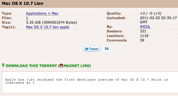 Nedávno Apple dal možnosť vývojárom si stiahnuť a nainštalovať betu nového operačného systému – Mac OS X Lion. Táto verzia je zatiaľ dostupná len pre vývojárov, no napriek tomu sa objavila možnosť si tento OS stiahnuť zo stránok s torrentmi – nelegálne. Tak sa Lion šíri svetom, inštalujú si ho aj ľudia, ktorí vývojármi nie sú.