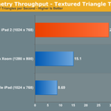 V prvním testu se GLBenchmark 2.0 zaměřil na to, kolik dokáží jednotlivé tablety zobrazit trojúhelníků za vteřinu. Apple iPad 1. generace dokázal díky svému výkonu zobrazit 8,7 milionu troúhelníků za jedinou vteřinu. Motorola Xoom zvládá 15.1 milionů trojúhelníků za vteřinu, což je poměrně vysoké číslo, kdyby ovšem neexistovala 2. generace iPadu, který dokáže zobrazit 29 milionů trojúhelníků za jedinou vteřinu. Oproti Motorole je tedy výkon téměř dvojnásobný. Oproti původnímu iPadu by nyní mohli vývojáři až ztrojnásobit složitost geometrie jednotlivých prvků v aplikacích, bez toho aby se tato skutečnost nějak podepsala na výkonu iPadu.