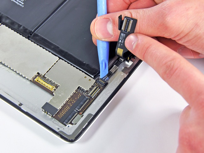 - Pomalu ale jistě nám na iPadu 2 už nic moc nezbývá a blížíme se tak do cíle. Po odmontování dvou šroubků odstraníme 30-pinový Apple dock konektor, ten se nemění a většina příslušenství je tak stále kompatibilní, spousty z vás doufalo v USB konektor ale ten se v iPadu 2 opět nekoná.