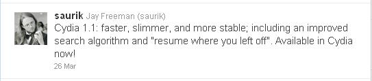 Pokud máte jakékoliv iOS zařízení a měli jste na něm proveden jailbreak, a nebo o něm víte jen z doslechu, jistě jste zaslechli o aplikaci, kterou vyvíjel Jay „Saurik“ Freeman, o Cydii. Ta během tohoto víkendu dostala svou první velkou aktualizaci a je tedy k dispozici na stáhnutí update ve verzi 1.1, co nám tato „velká“ aktualizace přináší za vylepšení, se dozvíte na následujících řádcích. Saurik o této aktualizaci informoval na svém Twitteru, samozřejmě že všichni co spatřili tuto zprávu, začali okamžitě aktualizaci stahovat.