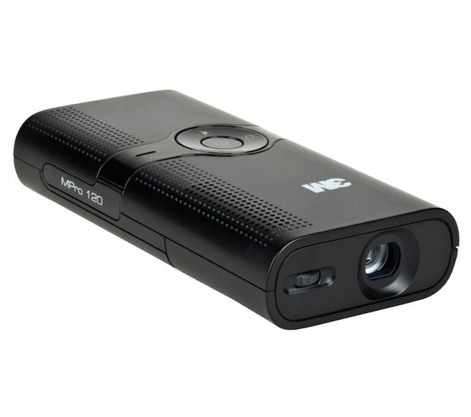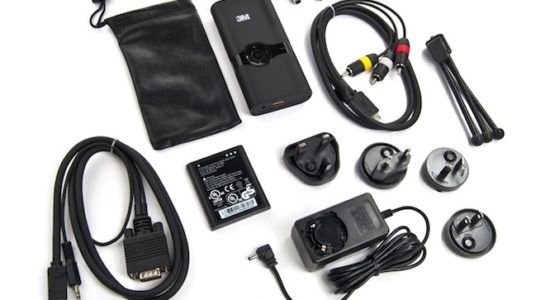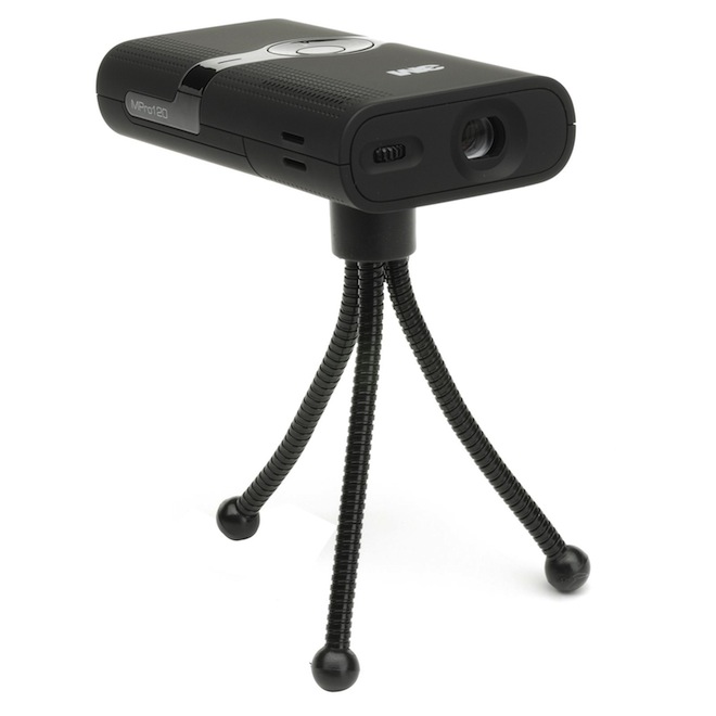 V nemalé krabici naleznete společně s projektorem adaptér do zásuvky, kabel na propojení s počítačem, RCA kabely, stojan, ochranné pouzdro, příručku Průvodce rychlým startem a Bezpečnostní příručku. První věc co vás na projektoru zaujme je jeho miniaturní velikost. Konkrétně 120 x 60 x 24 mm. Projektor se vám bez větších problémů vejde do kapsy a třeba v brašně s notebookem nepoznáte, že nesete něco navíc. Jeho hmotnost je 154 gramů včetně vyměnitelné baterie. V ruce skoro nepocítím rozdíl mezi projektorem a iPhonem 4.