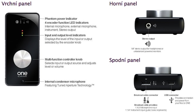 Připojení nástrojů k Apogee One a jeho spolupráce s hudebním software Apple bude popsáno v samostatném článku od profesionálního hudebníka.