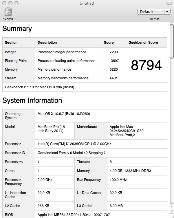 Na následujícím obrázku vidíte Geekbench test MacBook Pro 15″ s procesorem Intel i7 quad-core na frekvenci 2.0Ghz, 4GB operační paměti na frekvenci 1333Mhz, grafickou kartou Intel HD Graphics 3000 s 384MB DDR3 a AMD Radeon HD 6490M s 256MB GDDR5 paměti a SSD diskem OCZ Vertex 2 s rychlostí čtení/zápisu dat okolo 300Mb/s. Test byl proveden po restartu systému Mac OS X 10.6.7 Snow Leopard a v jeho průběhu nebyla spuštěna žádná jiná aplikace. Test byl proveden po restartu systému Mac OS X 10.6.7 Snow Leopard a v jeho průběhu nebyla spuštěna žádná jiná aplikace. Test byl proveden celkem 5x a byl vybrán průměrný výsledek, výsledky testu se lišily v řádu jednotek bodů.