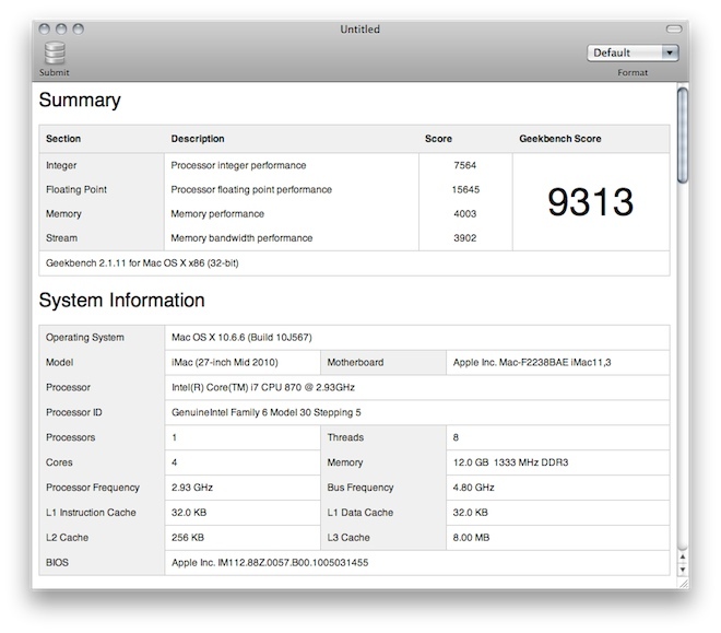 Na následujícím obrázku vidíte Geekbench test iMac s procesorem Intel i7 na 2.93Ghz, 12GB DDR3 operační paměti na frekvenci 1333Mhz, grafickou kartou ATI HD 5750 a 1TB pevným diskem s 7200 otáčkami za minutu. Test byl proveden po restartu systému Mac OS X 10.6.7 Snow Leopard a v jeho průběhu nebyla spuštěna žádná jiná aplikace. Test byl proveden celkem 5x a byl vybrán průměrný výsledek, výsledky testu se lišily v řádu jednotek bodů.