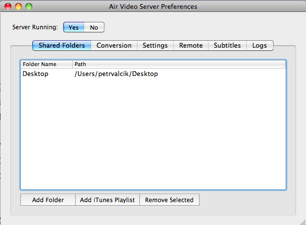 K tomu aby program fungoval, je potřeba splnit několik kroků. Jako první je nezbytné nainstalovat na váš počítač Air Video Server, který je volně ke stažení na stránkách výrobce. Program je dostupný jak ve verzi pro Mac OS X, tak pro Windows XP a vyšší. Po nainstalování Serveru se v horní liště objeví malá ikona, která značí že program běží. Po kliku pravým tlačítkem se můžeme dostat do nabídky preferences. Zde je potřeba pod položkou “Shared Folders“ vybrat složky, ve kterých máte na počítači uložená videa, které chcete na iPadu/iPhonu přehrávat. Pod dalšími záložkami preferences můžeme nalézt nastavení několika dalších věcí, jako například, chceme-li aby se server automaticky zapínal při startu počítače, nebo zda má při připojení vyžadovat heslo. Zajímavá funkce, která je zatím v testovacím stavu je přehrávání videjí přes internet. Tuto funkci, jsem bohužel nedokázal přimět ke spolupráci, protože, když se na iPhonu pokusím přehrát video dálkově, dočkám se jen nekonečného načítání. Pokud budete mít více štěstí, podělte se o vaše zkušenosti v komentářích pod článkem. V poslední pro nás důležité položce subtitles, tedy v případě, že chceme přehrávat titulky, je nutné nastavit kódování. Pro správné zobrazování češtiny vyberte Unicode UTF-8. Teď už stačí jen zkontrolovat zda server běží, což nám značí tlačítko Server Running v horní části nastavení.