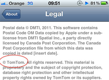 Při pozorném čtení Copyrightu však zjistíte, že Tom Tom není jedinou společností, která má něco společného s navigacemi a která je zároveň zmíněna v iOS 5. Mezi další patří například CoreLogic nebo MapData. Jejich kompletní výčet je zde: