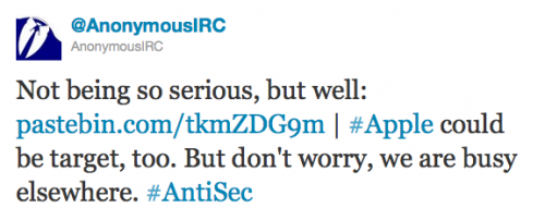 Skupina hackerů zveřejnila zprávu, podle které mají dokument obsahující uživatelská jména a hesla pro přístup na servery společnosti Apple. Tento útok má být součástí hackerské kampaně probíhající v posledních měsících, jejíž obětí se staly významné vládní i firemní servery. AntiSec, jak se hackerská kampaň probíhající v posledních týdnech nazývá zahrnuje hackery ze skupiny Anonymous a dnes již zaniklé skupiny Lulz Security. Právě během této kampaně byl skupinou získán dokument, který údajně obsahuje 26 administrátorských jmen a hesel pro přístup do serverů společnosti Apple.