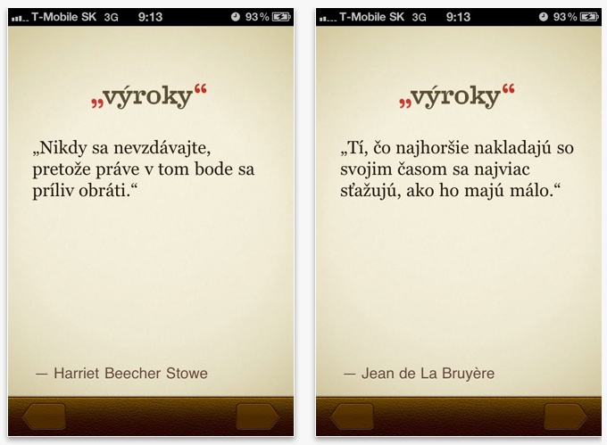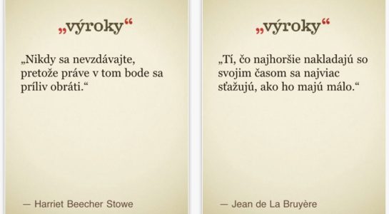 Slovenská aplikace Výroky obsahuje zhruba 500 nejrůznějších výroků od mnoha slavných osobností lidské historie. V jednoduchém uživatelském prostředí aplikace je zobrazen vždy jen jeden výrok s tím, že na další přepnete buď pomocí přejetí prstem vlevo nebo vpravo, popřípadě můžete využít i malé šipky v dolní části obrazovky. Díky absenci jakéhokoliv nastavení je aplikace opravdu jednoduchá a zcela poslouží svému účelu.