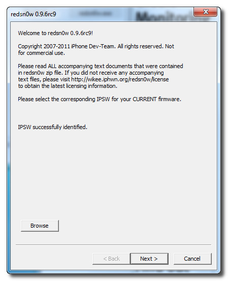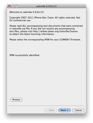 3. Jakmile Redsn0w úspěšně identifikuje IPSW, klikněte na tlačítko Next.