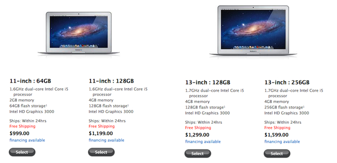 Nejlevnějším Macbookem Air se stal 11 palcový model s procesorem Core i5 o taktu 1.6 Ghz, 2 GB operační paměti (je však možné si připlatit za 4 GB), flash úložištěm o kapacitě 64 GB a grafickou kartou Intel HD Graphics 3000. Tento model je dostupný za 999 USD a měl by se stát novým základním modelem značky. Druhým 11 palcovým modelem je Macbook Air s 4 GB operační paměti a úložištěm o kapacitě 128 GB (za příplatek je možné osadit flash úložištem o kapacitě 256 GB). Ostatní komponenty tento model sdílí s nejlevnějším modelem (procesor je však možno za příplatek nahradit procesorem Core i7 1.8 Ghz) a je dostupný za 1199 USD.
