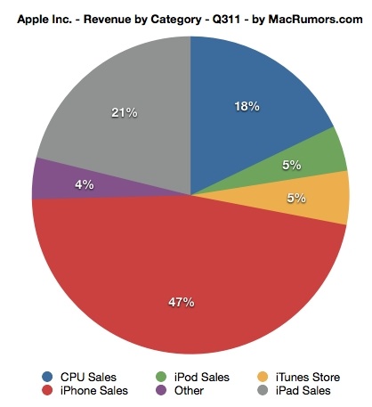 Apple prodal 3,95 milionů počítačů Macintosh v tomto čtvrtletí, což je 14% nárůst oproti stejnému období v roce 2010. Čtvrtletně se prodalo 20,34 milionů iPhonů, což je nárůst o 142% oproti stejnému období v předcházejícím roce. Apple také prodal 7,54 milionů iPodů v průběhu čtvrtletí, což je meziroční pokles o 20%. Prodeje iPadů se zastavili na čísle 9,25 milionů kusů, což je meziroční nárůst o 183%.