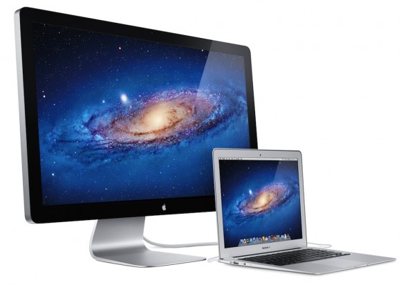 Velký Thunderbolt displej je vybaven LED technologií a dokáže zobrazit obraz v rozlišení 2560×1440 bodů. Design displeje zůstal nezměněn, co se ale změnilo jsou konektory. Nyní zde najdeme 3 porty USB, FireWire 800, port Thunderbolt pro přenos obrazu a dat a nově také Ethernet. Všechny kabely vedoucí z displeje používají MagSafe a tak se z něj stala ideální pracovní stanice, kterou je díky přítomnosti Ethernetového portu možné používat i s Macbookem Air, který je možné k síti připojit pouze pomocí Wifi. Nyní je však možné připojit Ethernetový port do displeje a připojení sdílet přes Thunderbolt do Macbooku. Samozřejmostí je i integrace Facetime kamery s mikrofonem do horní části displeje. Recenzi Apple LED Cinema Display si můžete přečíst zde.
