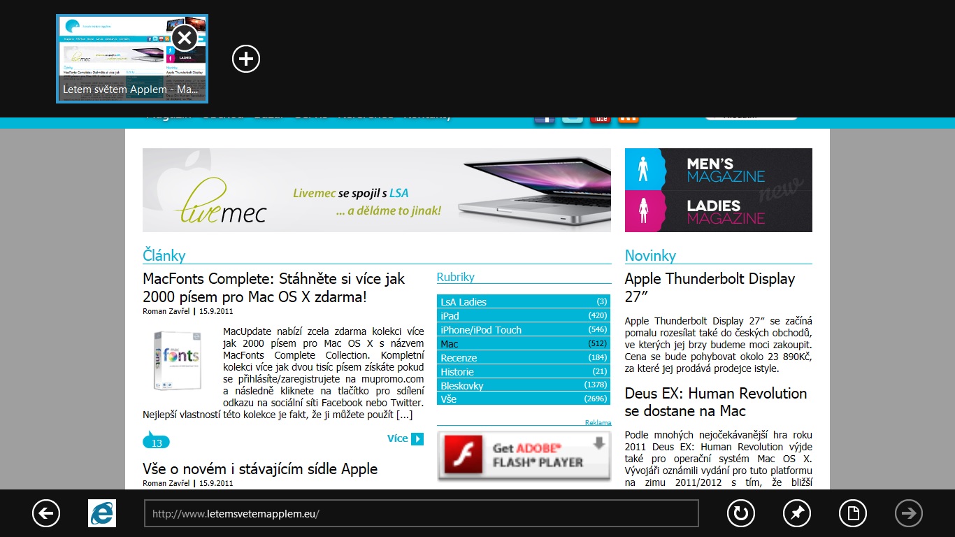 S novým operačním systémem přichází i nový internetový prohlížeč. Ve verzi Developer Preview je integrován již tradiční Internet Explorer, tentokráte však ve verzi 10. Ten je v prostředí Metro zcela přizpůsoben pro používání na dotykových tabletech. I na průměrné sestavě se chová velice svižně, troufám si dokonce říci, že jde o jeden z nejrychlejších prohlížečů, s nimiž jsem měl možnost se setkat (a to jde pouze o vývojovou verzi). V současném buildu Windows 8 má však Explorer jednu nepříjemnou vlastnost. Pokud si jej otevřete v prostředí Metro a načtete si libovolnou stránku, po přepnutí do klasického režimu plochy je Explorer deaktivovaný a vy jej musíte znova spustit. Explorer se prostě chová, jako kdyby byly ve Windows nainstalovány dva prohlížeče současně. V současné době nelze říci, jestli jde o chybu nebo o vlastnost.