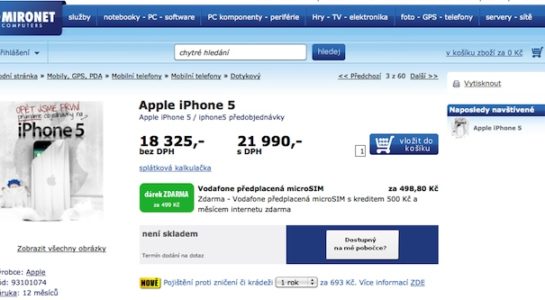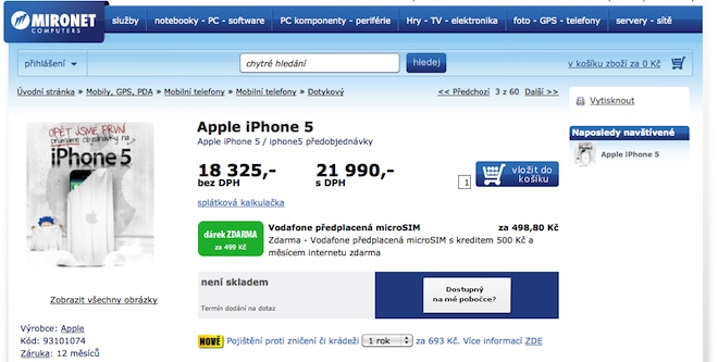 Český internetový obchod s IT zbožím Mironet.cz zveřejnil předobjednávky na nový model mobilního telefonu společnosti Apple iPhone 5. Telefon je podle prodejce možné předobjednat za cenu 21 990Kč, která jak upozorňuje je pouze informativní a bude upřesněna. Poněkud s úsměvem je nutné brát předobjednávku na mobilní telefon u kterého prodejce uvádí: Parametry – dosud neznámé, Vzhled – dosud neznámý, Cena – dosud neznámá odhadována na 21 990Kč, Termín dodání přislíbeno v říjnu. Tyto informace se nachází na propagačních materiálech, které jistě vedou ke zvýšení návštěvnosti internetového obchodu a zařazení do katalogu také k lepší pozici ve vyhledávačích mocí optimalizace SEO. Zajímavé však je, že v popisu zboží je uveden termín dodání mezi Říjnem a Listopadem. To je poněkud překvapující, jelikož pokud by měly informace na mironet.cz pravdu, bude iPhone 5 (podle nás iPhone 4s) nejdražším modelem iPhone v historii společnosti Apple a zároveň modelem, který se do jednoho měsíce od oficiálního představení začne prodávat v ČR.