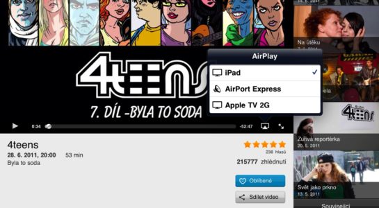 K velké radosti majitelů Apple TV druhé generace byl aktualizován program iVysílání na verzi 1.4. Mezi změnami je uvedena podpora iOS5, lepší uživatelské rozhraní a drobné opravy. V každém případě konečně začal fungovat AirPlay obrazu i zvuku do ATV 2G samozřejmě i ze systému iOS4.3, tak jak tomu je od července např. u aplikace TV Barrandov. Díky nejspíš chybě to iVysílání doteď neumožňovalo. To, že aplikace nefunguje na pozadí, jako např. systémová videa, ani tolik snad nevadí. Dobré je, že se přístroj dá v době přehrávání AirPlayem uspat např. Smart Coverem u iPadu 2, či Sleep tlačítkem u ostatních přístrojů a tak maximálně šetřit baterii. Pak se dá puštěné video řídit dálkovým ovládačem k Apple TV.