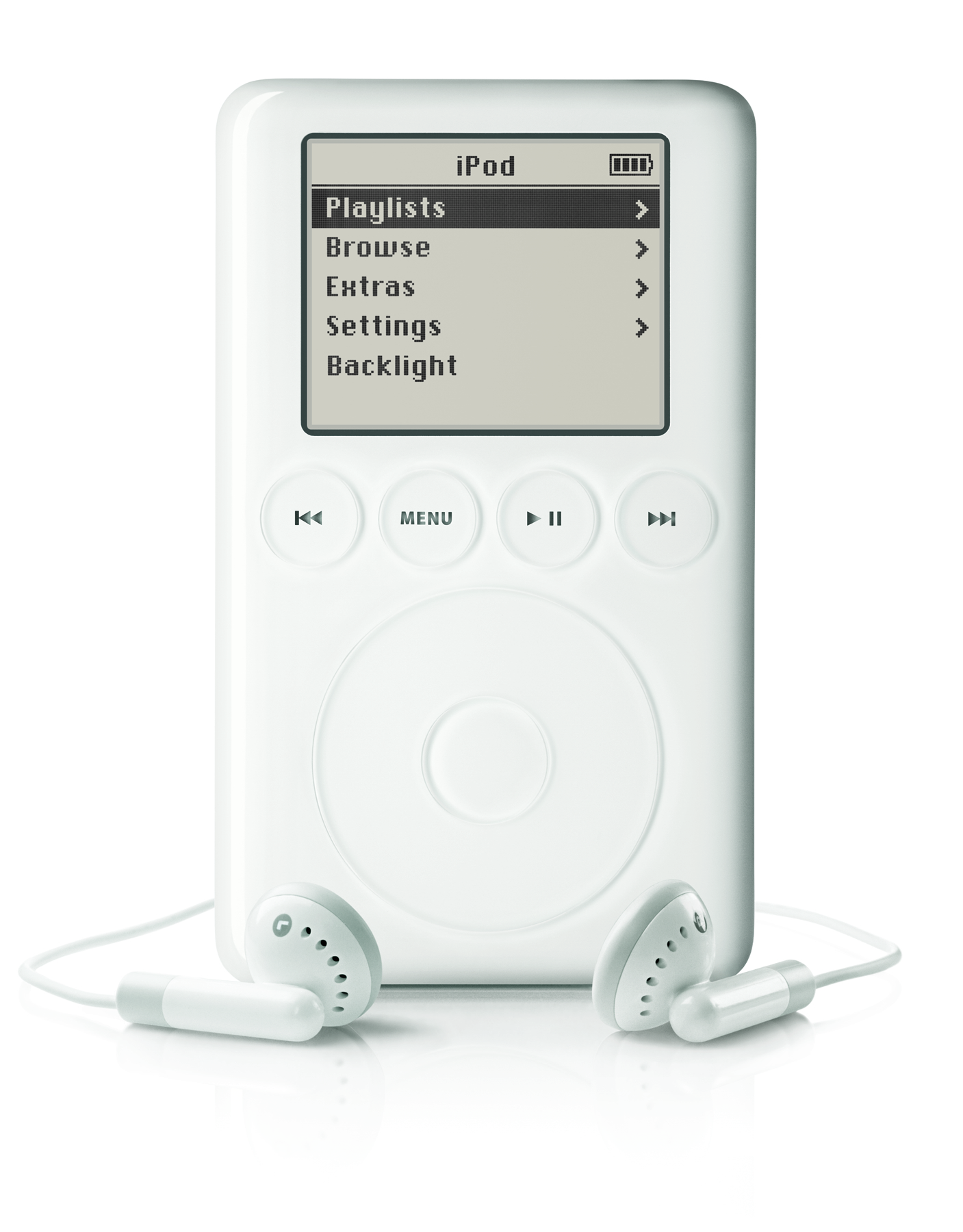 Třetí generace hudebního přehrávače Apple iPod byla uvedena 28. dubna 2003. Toto datum bylo klíčové i v tom, že na představovacím launchi tohoto produktu spatřil poprvé světlo světa iTunes Music Store se startovací nabídkou 200.000 skladeb i v té době po 99¢ za kus. Oproti první generaci iPodu byl tento model o něco menších rozměrů, s větší kapacitou vnitřního pevného disku, místo FireWire konektoru byl poprvé v dolní podstavě integrován dock konektor. Tento interface měl však trochu odlišné zapojení, než v pozdější době. Pro nabíjení a přenos dat byl nutný dodaný FireWire kabel, dnešní USB kabel se dal použít pouze jako datový, nikoliv jako nabíjecí. Novinkou bylo s doplňky od např. firmy Belkin nahrávat zvuk iPodem či kopírovat obsah paměťové karty z digitálního fotoaparátu na disk iPodu. Design byl opět ve sněhobílé barvě „iBook white“, dominovaly zakulacené hrany a rohy, zadní část byla z lesklého kovu. Vedle zvukového výstupu se zde objevil speciální čtyřpinový konektor, který sloužil pro další příslušenství přístroje (radiový transmitér Belkin iTrip, doplněk pro nahrávání zvuku Belkin Voice Recorder či prodlužovací sluchátkový výstup s dálkovým ovládáním). Display byl podsvícený dvoupalcový monochromatický LCD panel. Ovládání bylo dotekově citlivým pevným kolečkem (Touch Wheel) s vnitřním tlačítkem podobně jako u druhé generace iPodu z roku 2002. V části pod displayem přibylo kvarteto senzorových tlačítek, která byla při aktivaci oranžově podsvícena. V dodávce byla původní Apple sluchátka jako u prvního iPodu. Standartně se v té době v balení dodával dokovací stojánek s audiovýstupem, plátěný obal na přístroj, kožené pouzdro Apple s opaskovým klipsem, zvukový prodlužovací kabel s dálkovým ovládáním na klipsu a samozřejmě FireWire nabíječka. Internet v každé domácnosti ještě tak samozřejmý nebyl, takže jsme objevili v krychlové krabičce i instalační CD na program iTunes.